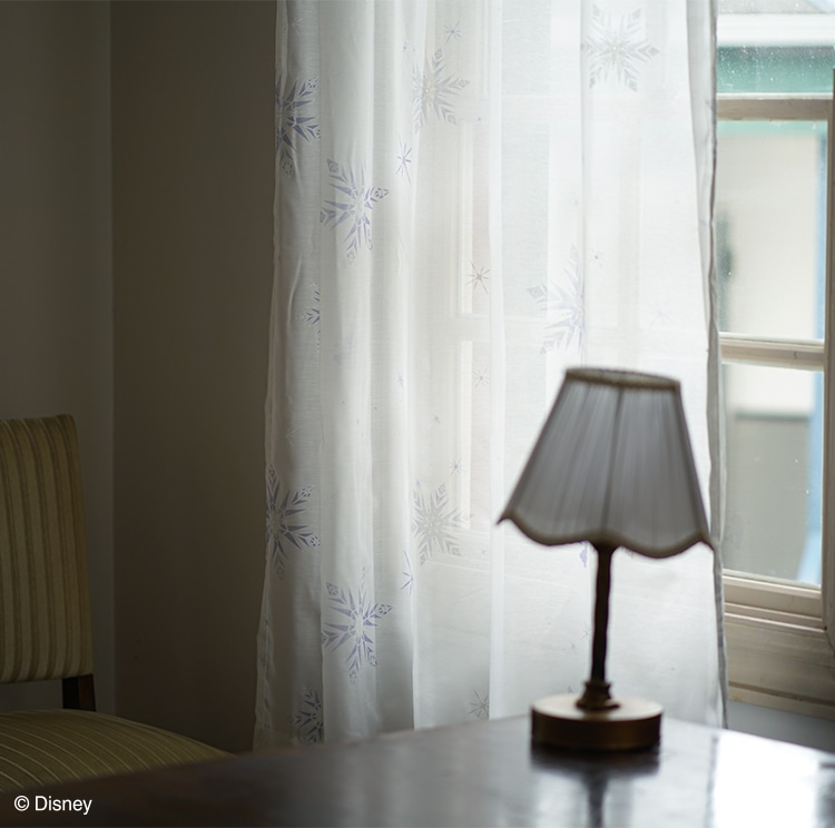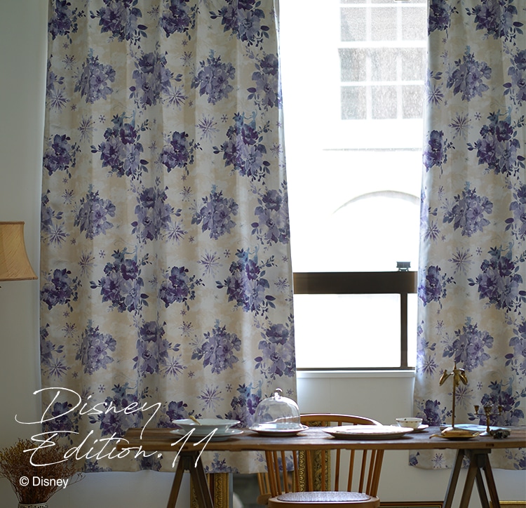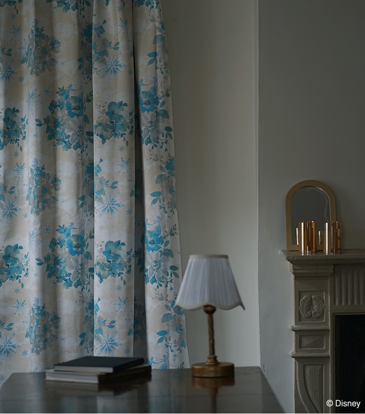 雪の結晶と水彩で描いた花々にアナとエルサをあしらったエレガンスデザインの遮光カーテン。氷と魔法が織りなす、アナと雪の女王ならではの世界観を表現した上品な仕上がり。