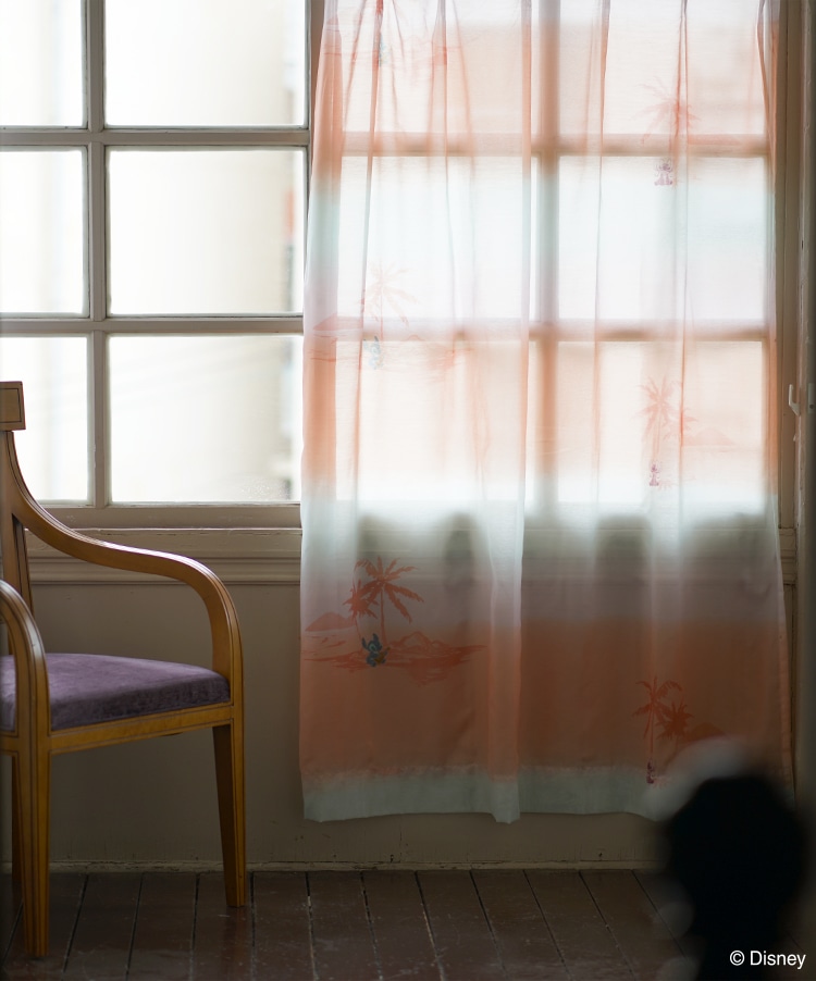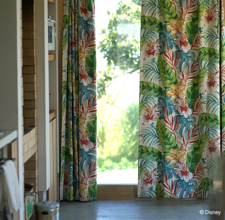 愛らしい表情のスティッチと南国の大自然が息づくようなダイナミックなリーフとハイビスカスをあしらった遮光カーテンです。