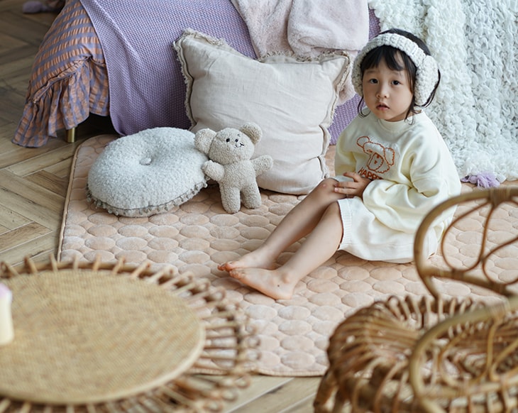 蓄熱綿を中綿にブレンドした肌寒い季節の底冷えから守ってくれる、超快適なキルティングラグ。防ダニ加工+低ホルムアルデヒドで小さなお子さんのいるご家庭でも安心・安全にお使いいただけます。