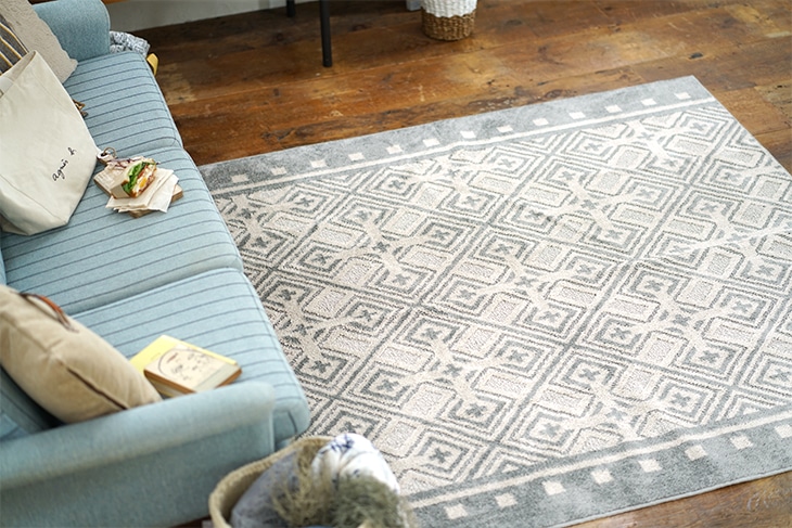 淡い色糸を使用した爽やかなライトブルー。優しく色素の薄い床色と相性が良く、ナチュラル?大人可愛いお部屋にぴったりです。くすんだ色合いなので、柄がはっきりしすぎないのもおしゃれなポイントです。