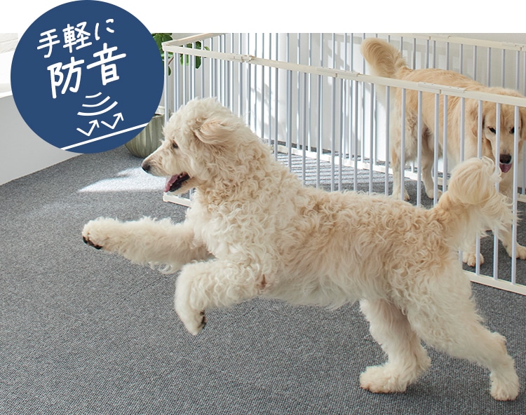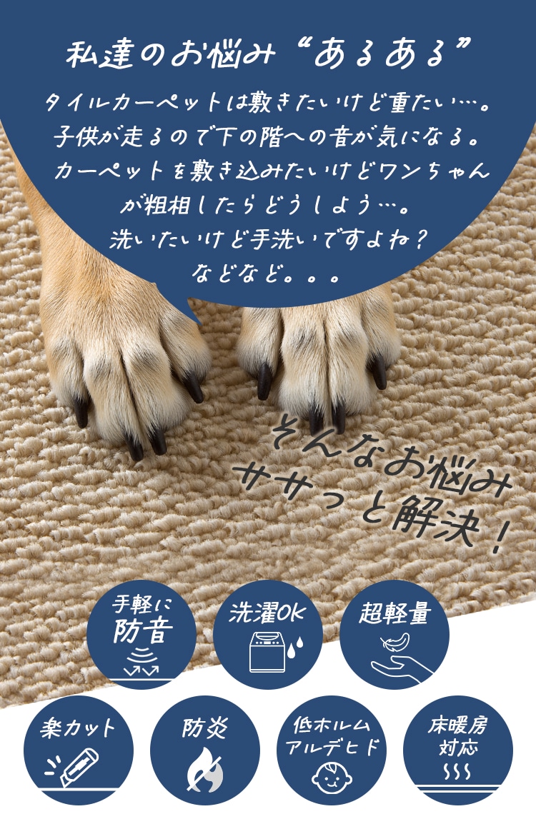 マンションに住んでると下の階への配慮、子供が走るだけで過敏になってストレスになったり…。そんなママやパパの心の“重さ”を軽くしてくれる遮音等級ΔLL(I)-5の防音性能!!音がほとんど気にならないレベルまで軽減されるタイルカーペットです。