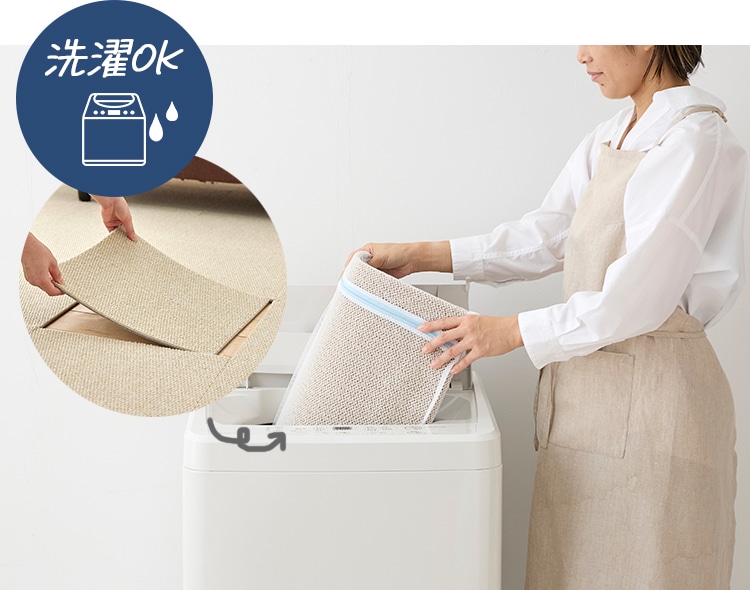 汚れた部分だけ外してお洗濯ができます。洗濯機で丸洗いが可能ですので、毎日清潔にお使いいただけます。(※洗濯ネット使用。)大きなラグを洗うよりも手軽で簡単。