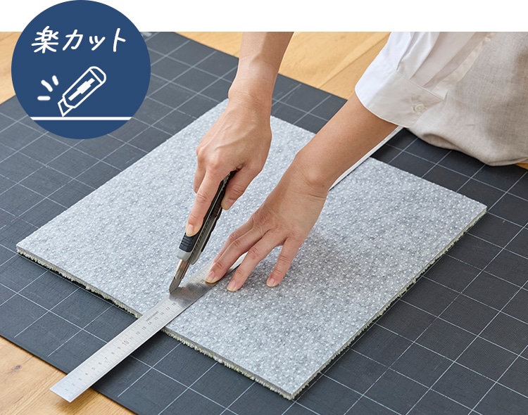 裏面が不織布のためポリ塩化ビニルのタイルカーペットとは違い、強く力を入れずにカッターでカットが可能です。必要以上に力を入れる必要がないので、女性のチカラでも簡単にカットできますよ!