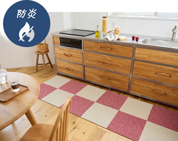 小さな火種が着火しても燃え広がりにくい「防炎」タイプ。日本防炎協会の防炎性試験に合格した安心・安全のタイルカーペットです。