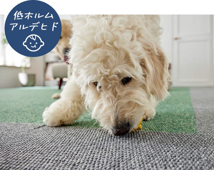 ホルムアルデヒドの放散量が最も少ない「F☆☆☆☆」認定の優しい素材で作ったタイルカーペットなので、安心してお使いいただけます。