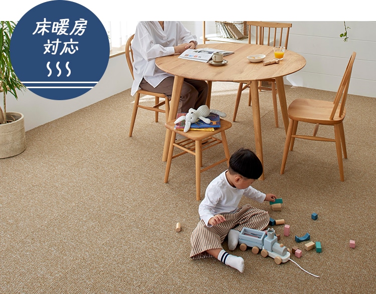 床暖房のフローリングでも耐熱加工なので、敷き詰める事ができます。床暖房+タイルカーペットで寒い季節も暖かく過ごせます。