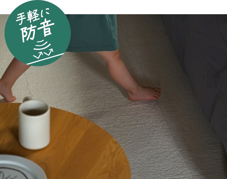 マンションに住んでると下の階への配慮、子供が走るだけで過敏になってストレスになったり…。そんなママやパパの心の“重さ”を軽くしてくれる遮音等級ΔLL(I)-5の防音性能!!音がほとんど気にならないレベルまで軽減されるタイルカーペットです。