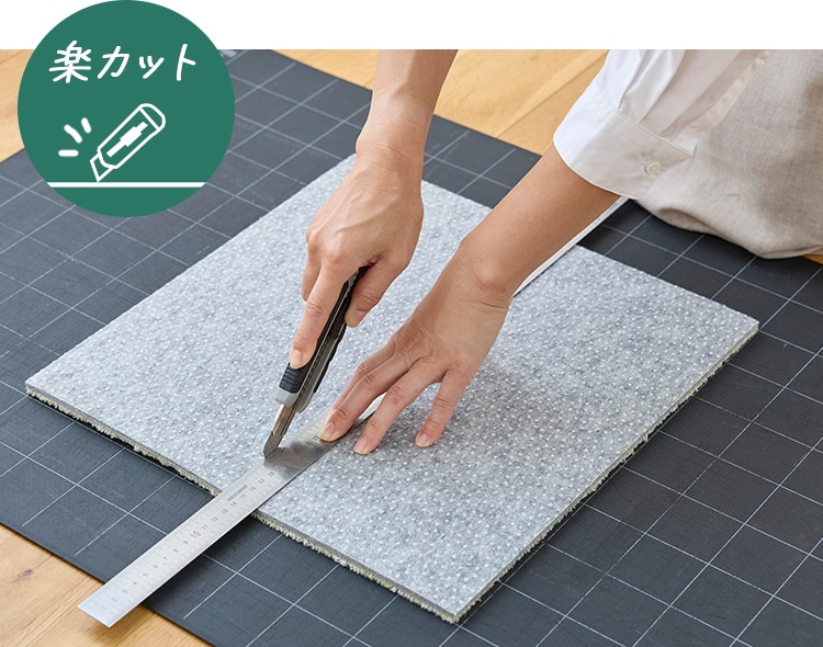 裏面が不織布のためポリ塩化ビニルのタイルカーペットとは違い、強く力を入れずにカッターでカットが可能です。必要以上に力を入れる必要がないので、女性のチカラでも簡単にカットできますよ!