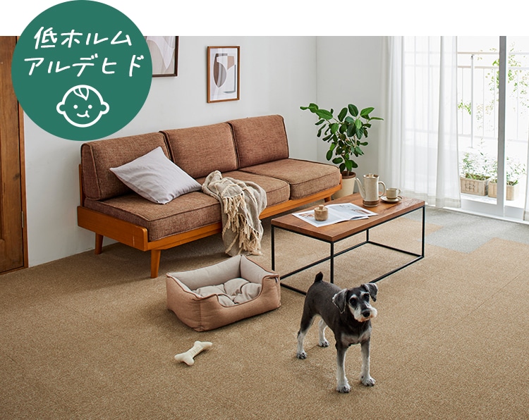 ホルムアルデヒドの放散量が最も少ない「F☆☆☆☆」認定の優しい素材で作ったタイルカーペットなので、安心してお使いいただけます。