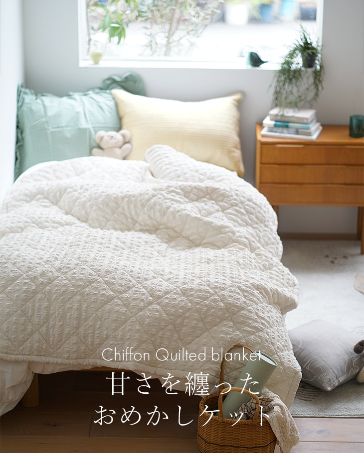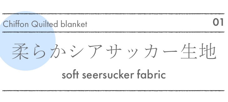 シアサッカー生地の爽やかな雰囲気と、シフォンの甘さを纏ったおしゃれな仕上がりのキルトケット。ポリエステルを使うことで、ハリと凹凸感のある心地良い肌触りを実現した、春夏に使いたくなるケットになりました。