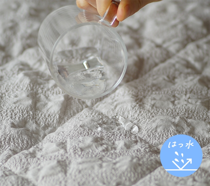 子供がジュースをこぼしたり、ペットが粗相しても、生地の表面が水分をはじいて、水玉状になる撥水加工付き。