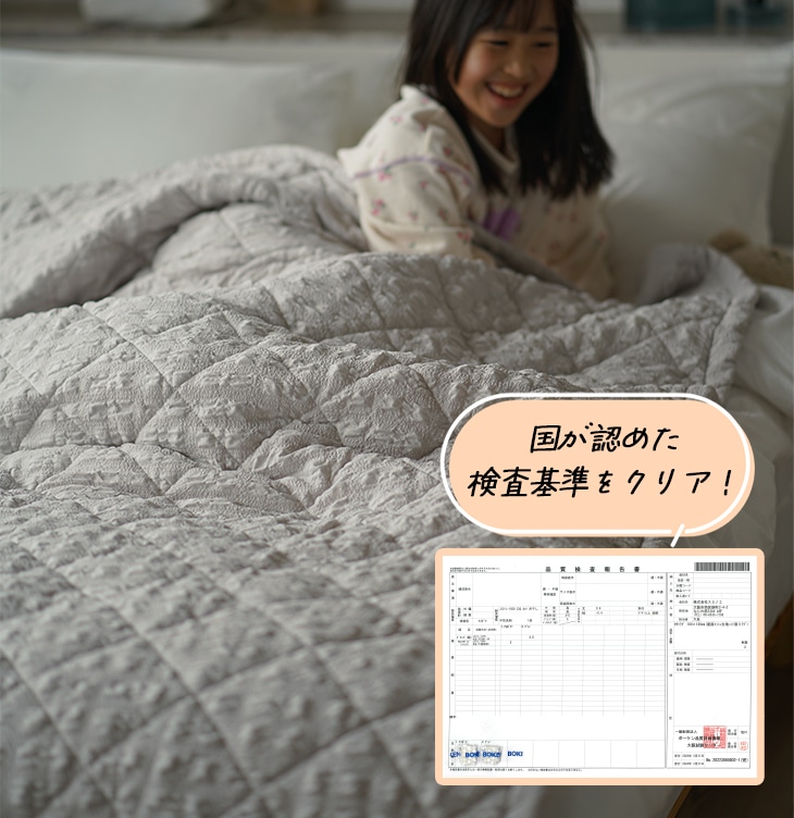また、ピリング検査でも摩擦への耐久性も高い基準をクリアした国の品質検査で認められた優秀なキルトケットです。