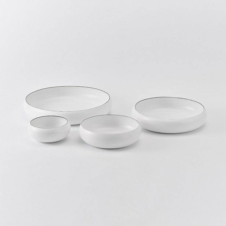 陶器のように柔らかな質感と金属の強さを生かした薄いフチのボウルです。