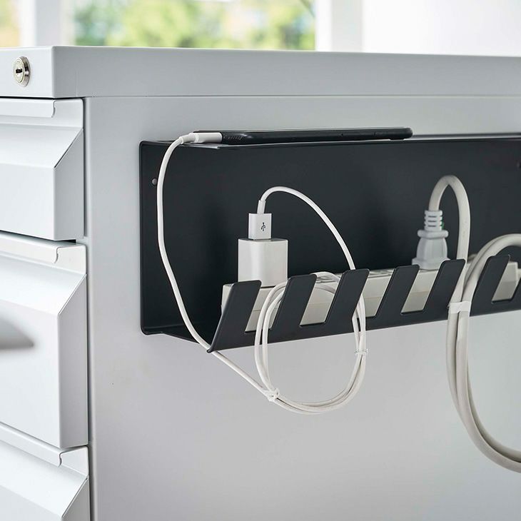 デスク下や壁面、スチールワゴンなどに簡単に取り付けできる電源タップ収納です。