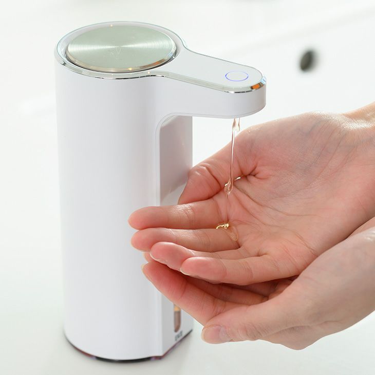 手をかざすだけで自動で洗剤が出てくる泡タイプのディスペンサーです。 本体に触れることが無いので衛生的です。 ソープの量を3段階調節することが出来ます。 USB充電式なので面倒な電池交換が必要ありません。