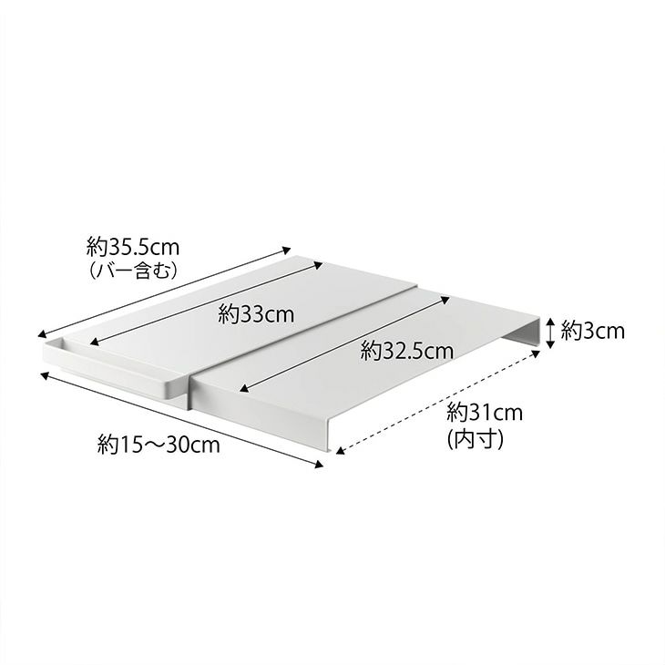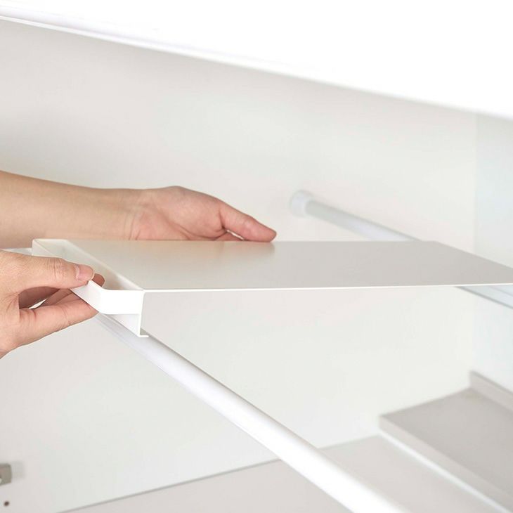 - お使いのつっぱり棒にのせるだけで棚が完成!伸縮式なので、使いたい幅に合わせて設置できます。