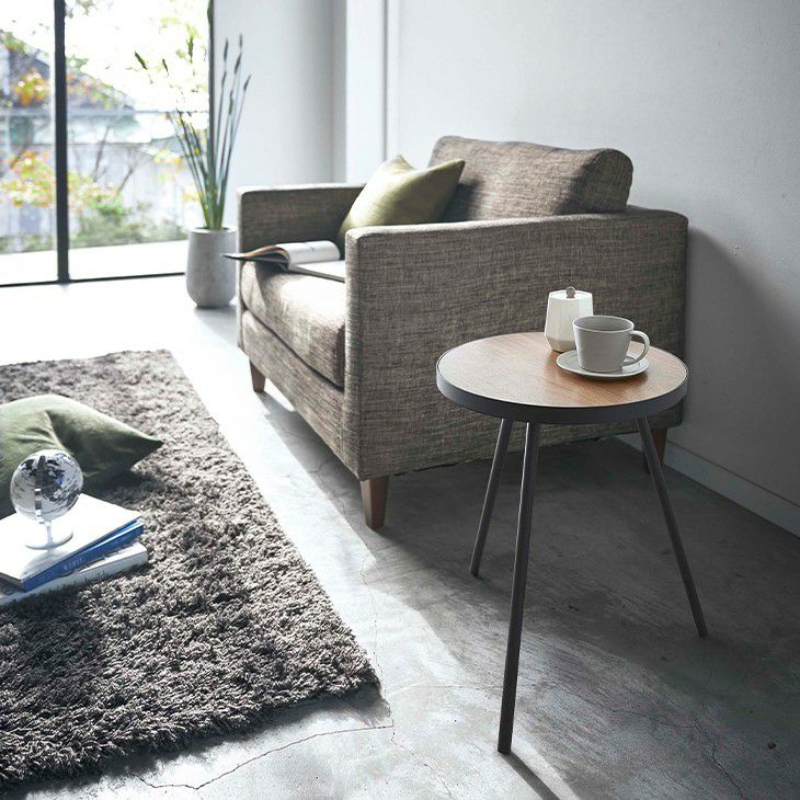 天然木の天板とスチールの組み合わせが美しいシンプルな丸型サイドテーブル。