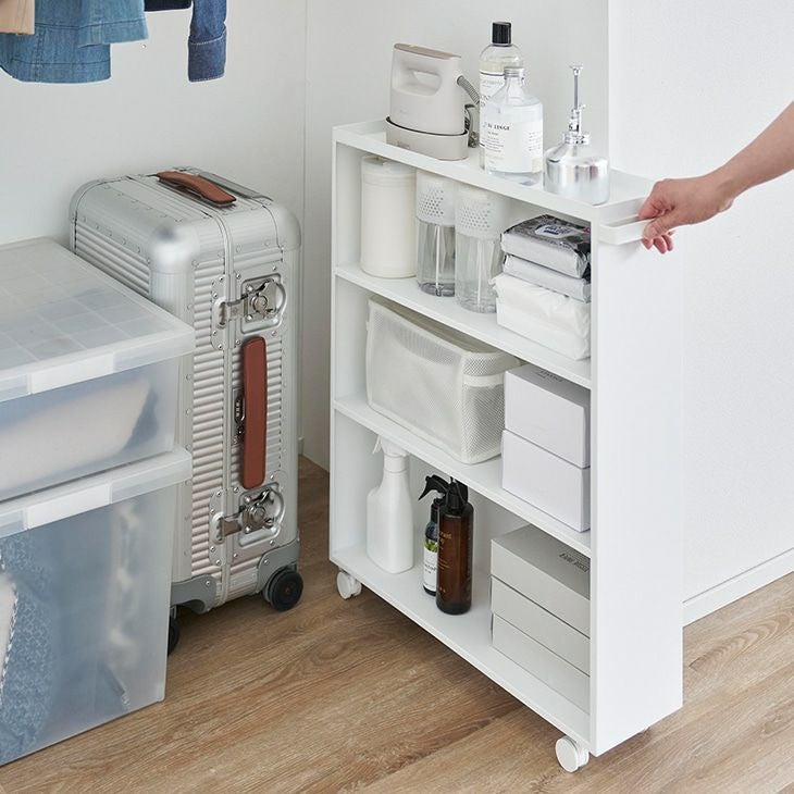 ハンドルとキャスター付きなのでスムーズに移動でき、来客時にラックを裏返せば隠して収納することがでます。