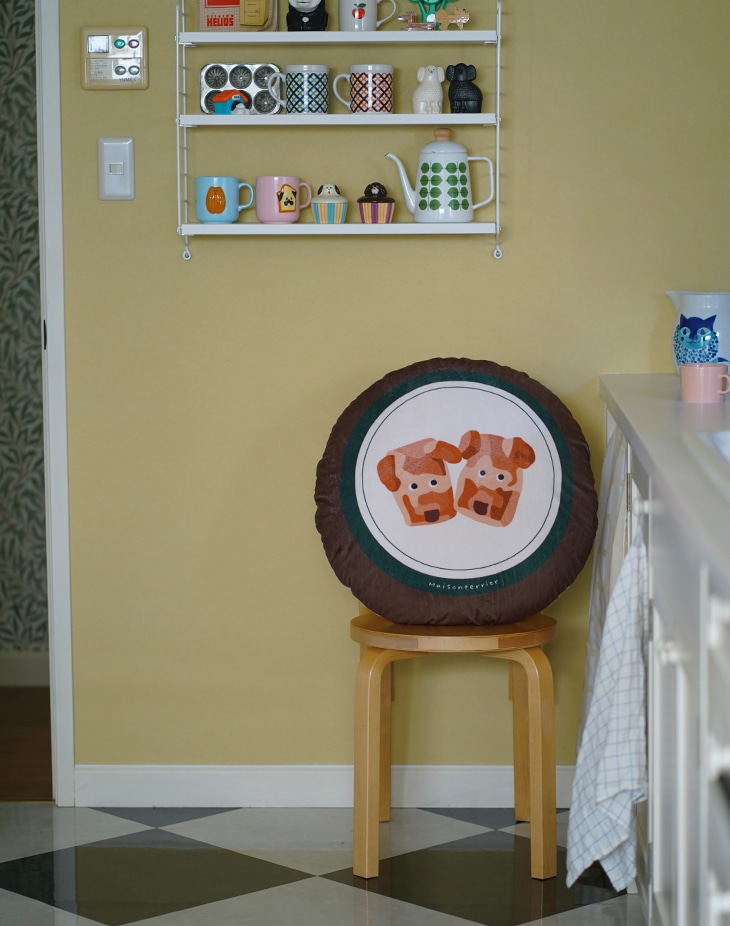 「上からお皿をみたとき」をイメージしたメゾン・テリアのおやつ犬がお皿に乗った愛らしい円形クッション。ボリューミーでふわっふわの厚みが心地よい60cmサイズを大きめクッションです。